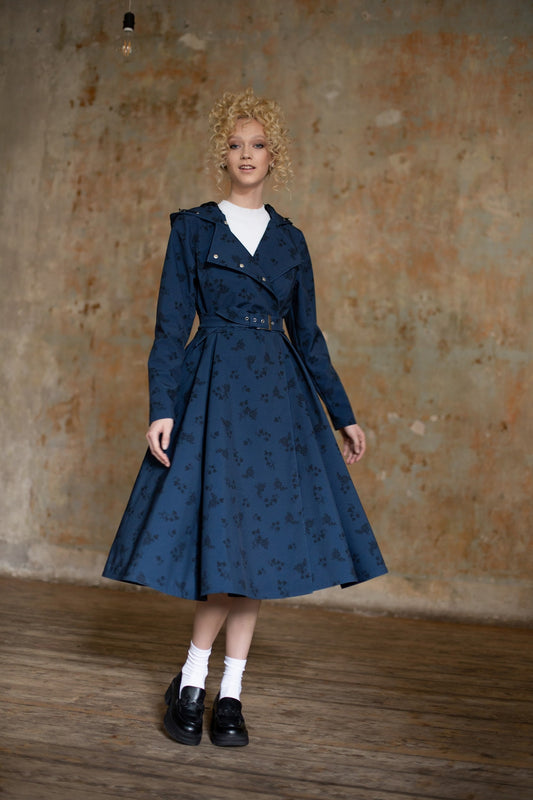 Kääriydy tähän kauniiseen kaksiriviseen takkiin, joka on valmistettu syvästä, Tummansininen kankaasta, jota koristaa musta kukkakuvio, joka muistuttaa keskiyön taivasta. Musta satiinivuori lisää ripauksen klassista kauneutta, pitäen sinut tyylikkäänä ja mukavana. Tämä takki yhdistää täydellisesti romantiikan ja eleganssin, tehden siitä välttämättömän jokaiselle naiselle, joka haluaa erottua missä tahansa säässä.