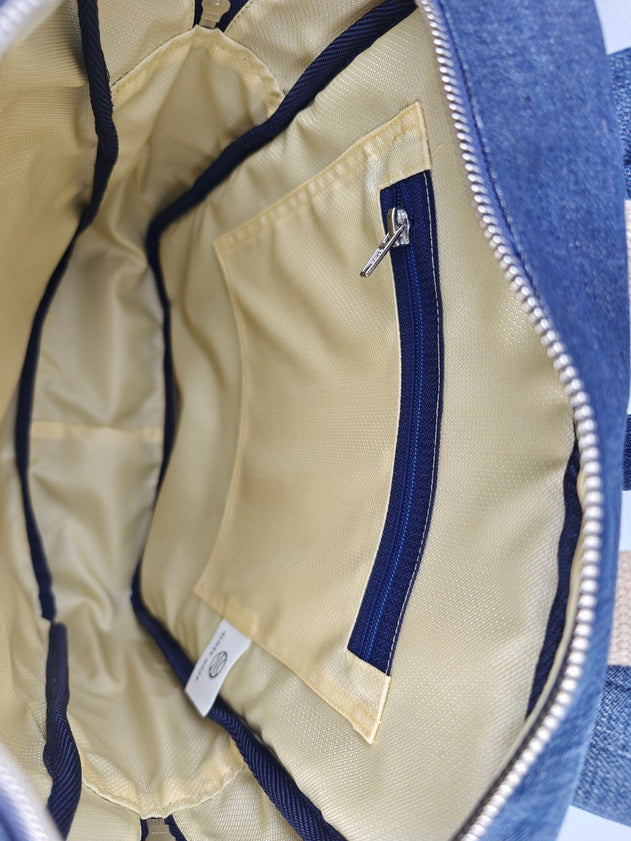 KAARINA-reppu denimissä yhdistää karkeaa kierrätettyä kangasta ja raikkaita beigejä yksityiskohtia ainutlaatuiseen jokapäiväiseen ilmeeseen. Siinä on turvallinen vetoketjullinen tasku sisällä, kätevä läppätasku ulkopuolella ja säädettävät pehmustetut hihnat napsautettavilla kahvoilla koko päivän mukavuuden ja monipuolisuuden takaamiseksi.
