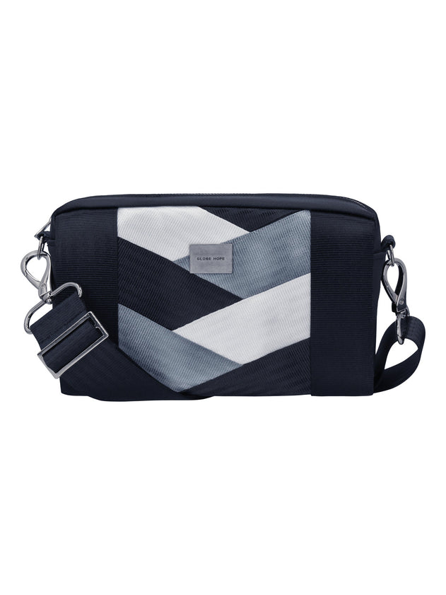 KASTE AURA -olkalaukku on valmistettu toisen laatuisista turvavöistä, yhdistäen klassisen mustan, harmaan ja valkoisen yhdistelmän kalanruotokuviossa. Kooltaan tämä laukku on yksi Globe Hope'n suosikeista. Riittävän suuri päivittäisiin tarpeisiin, olematta kuitenkaan suuri tai raskas laukku.