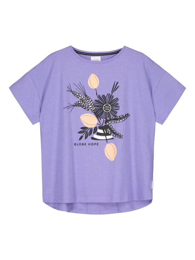 RIMPI t-paita tuo iloa vaatekaappiisi raikkaalla violetilla värillään ja kukkakuviollaan. Tämä t-paita on valmistettu kierrätetystä langasta. Sen kaunis kukkakuvio edessä tuo luonnonkauneutta arkeesi.