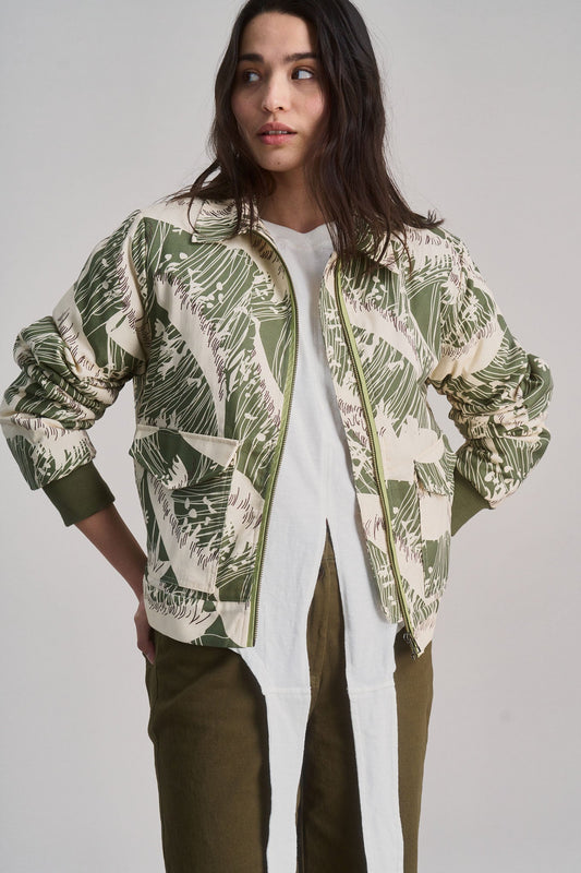 Tämä Vivi Organic Cotton Bomber -takki on kevyt ja ihanteellinen kevätkäyttöön. Luomupuuvillasta valmistettu takki tarjoaa hengittävyyttä ja mukavuutta, kun taas erottuva vihreä aaltokuvio lisää raikkaan ja dynaamisen ilmeen. Käytännölliset paikkataskut parantavat toimivuutta tinkimättä tyylistä, mikä tekee siitä monipuolisen valinnan siirtymäkausille.