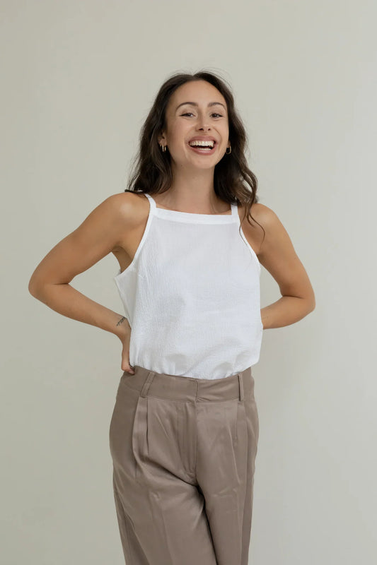 Tämä kevyestä luomupuuvillasta valmistettu yläosa on erittäin kevyt ja mukava iholla. Yläosa on valmistettu seersucker-kankaasta ja siinä on kevyt tekstuuri. Se antaa sinulle kevyen, kesäisen ilmeen ja on ehdoton must-have jokaiseen vaatekaappiin. Tämän hihattoman valkoisen puuvillatopin avulla sinulla on täydellinen vaate kapselivaatekaappiisi.