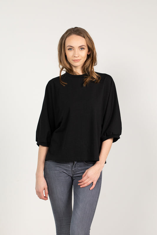 Nola's Yoko T-shirt is a minimalist cut t-shirt with wide sleeves that reach the elbow. The sleeves have ribbing at the openings, which creates a slight puff-sleeve effect.