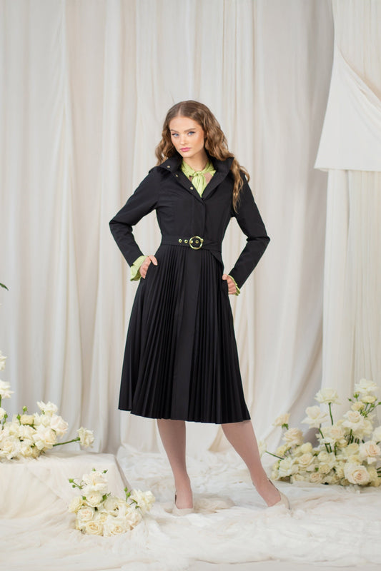 Fit and Flare Raincoat with Pleated A-Line Hem Black Sway