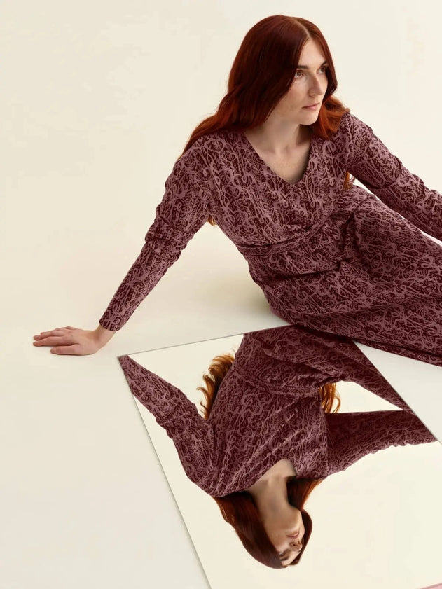 Simuna hurmaa sinut elegantilla vaaleanpunaisella kuosillaan, joka luo upean yhdistelmän mekon tumman pohjavärin kanssa ja nostaa sen välittömästi suosikkilistasi kärkeen. Pitkät hihat pitävät sinut lämpimänä ja mukavana viileämmälläkin säällä, kun taas vyötäröä korostava vyö luo naisellisen ja imartelevan siluetin. Mekko ulottuu pohkeeseen asti, mikä tekee siitä täydellisen valinnan monenlaisiin tilaisuuksiin.