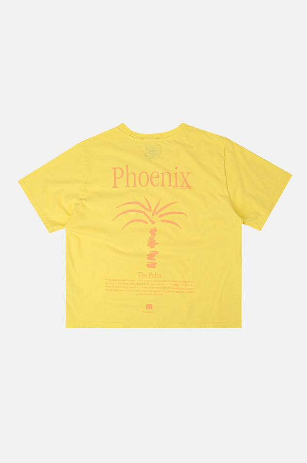 Tämä Phoenix Date Keltainen naisten pigmentti-T-paita sisältää lyhennetyn muotoilun, tarjoten tyylikkään ja modernin ilmeen mihin tahansa asuun. Phoenix-palmun inspiroimana, selkäpuolella on palmun kuvio yhdessä sanan "Phoenix" kanssa.