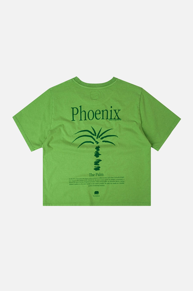 Tämä naisten pigmentti-T-paita Phoenix Raquis Vihreä:ssa sisältää lyhennetyn suunnittelun, tarjoten tyylikkään ja modernin ilmeen mihin tahansa asuun. Phoenix-palmun inspiroimana, selässä on palmun kuva yhdessä sanan "Phoenix" kanssa.