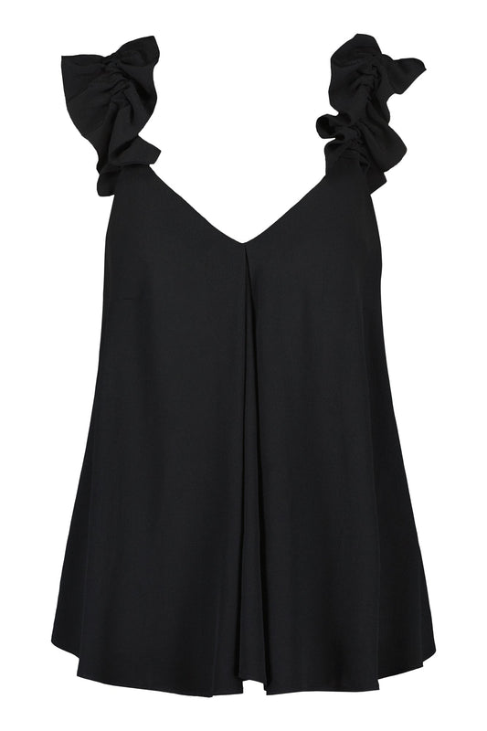 Upea Åva-toppi sisältää olkaimet, joissa on irrotettavat röyhelöt, jotka muistuttavat perhosia. Valmistettu vastuullisesti tuotetusta 100% EcoVerosta, materiaali laskeutuu ja virtaa kauniisti. Edessä olevat laskokset tarjoavat runsaasti tilaa keskiosalle, ja takana oleva jousto lisää leveyttä yläosaan kerääntymisellään. Olkaimen pituus on säädettävissä napeilla. Tämä kaunis toppi sopii sekä rentoihin että muodollisiin tilaisuuksiin. Voit myös käyttää yhtä röyhelöistä koristeellisena asusteena ranteessasi, jättäen toisen paikoilleen.