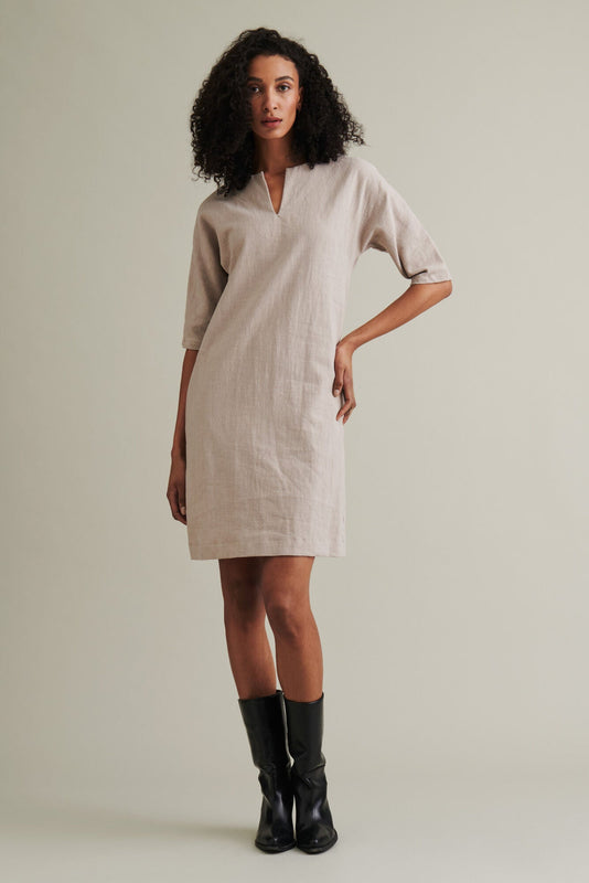Yksinkertaisesti kaunis ja klassinen pellavamekko. Siinä on kimono-hihat ja melko syvä halkio pääntiessä. Mekossa on suora siluetti. Valmistettu hieman paksummasta 100 % kivipestystä pellavasta, joka laskeutuu kauniisti ja on käsitelty pehmeäksi. Sivusaumassa on taskut.
