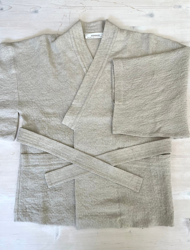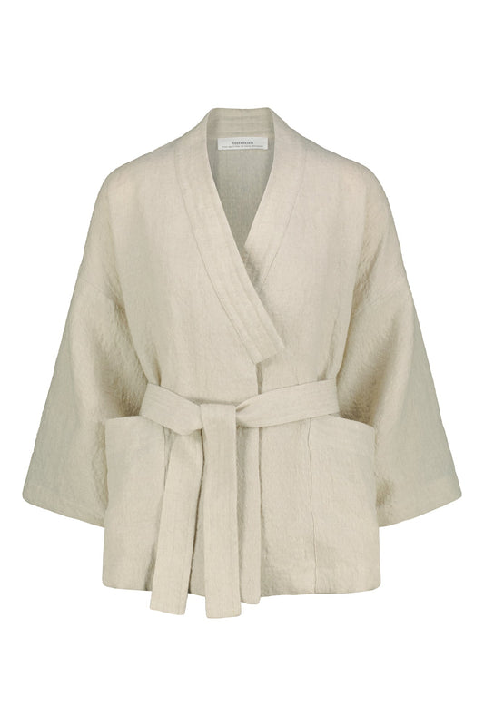 Örö-kimonotakki on upea yhdistelmä japanilaista minimalismia ja naisellisuutta. Upea kudottu pellava-villamateriaali on hienovarainen, hieman kukkakuvioinen. Kimonotakissa on leveät kimonohihat ja pääntiessä on kaunis leikkaus. Pituus ulottuu lonkan yläpuolelle. Vyö on valmistettu samasta materiaalista.
