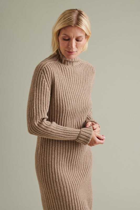Utön neulemekko on klassinen, pitkä ja tyylikäs villamekko, joka on valmistettu pehmeästä 100 % merinovillasta. Siinä on ajaton ja yksinkertainen suora muotoilu. Kaunis yksityiskohta on olkalinja, joka jatkuu saumattomasti hihasta pääntielle. Pystykaulus voidaan taittaa sisäänpäin lisäämään mukavan yksityiskohdan pääntielle. Pitkät hihat tarjoavat ihanaa lämpöä ja ne voidaan kääriä ylös lisärakenteen saamiseksi.