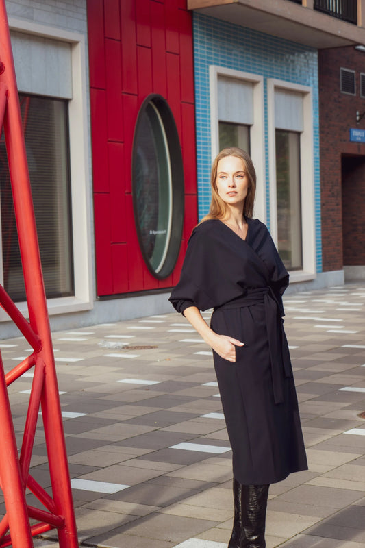 The Nola Kimono Dress is one of Nola's best-selling dresses because of its wrap-around design that suits a wide range of body types. This cut really works for most body types. The wine red, midi-length kimono dress is made of a slightly thicker fabric - and of course the dress has pockets!