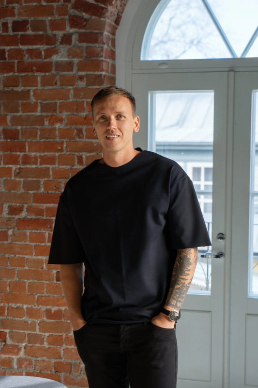 Materiaali: 60% viskoosia, 35% polyesteriä, 5% elastaania. Käsinpesu T-paita. Silitys sallittu.