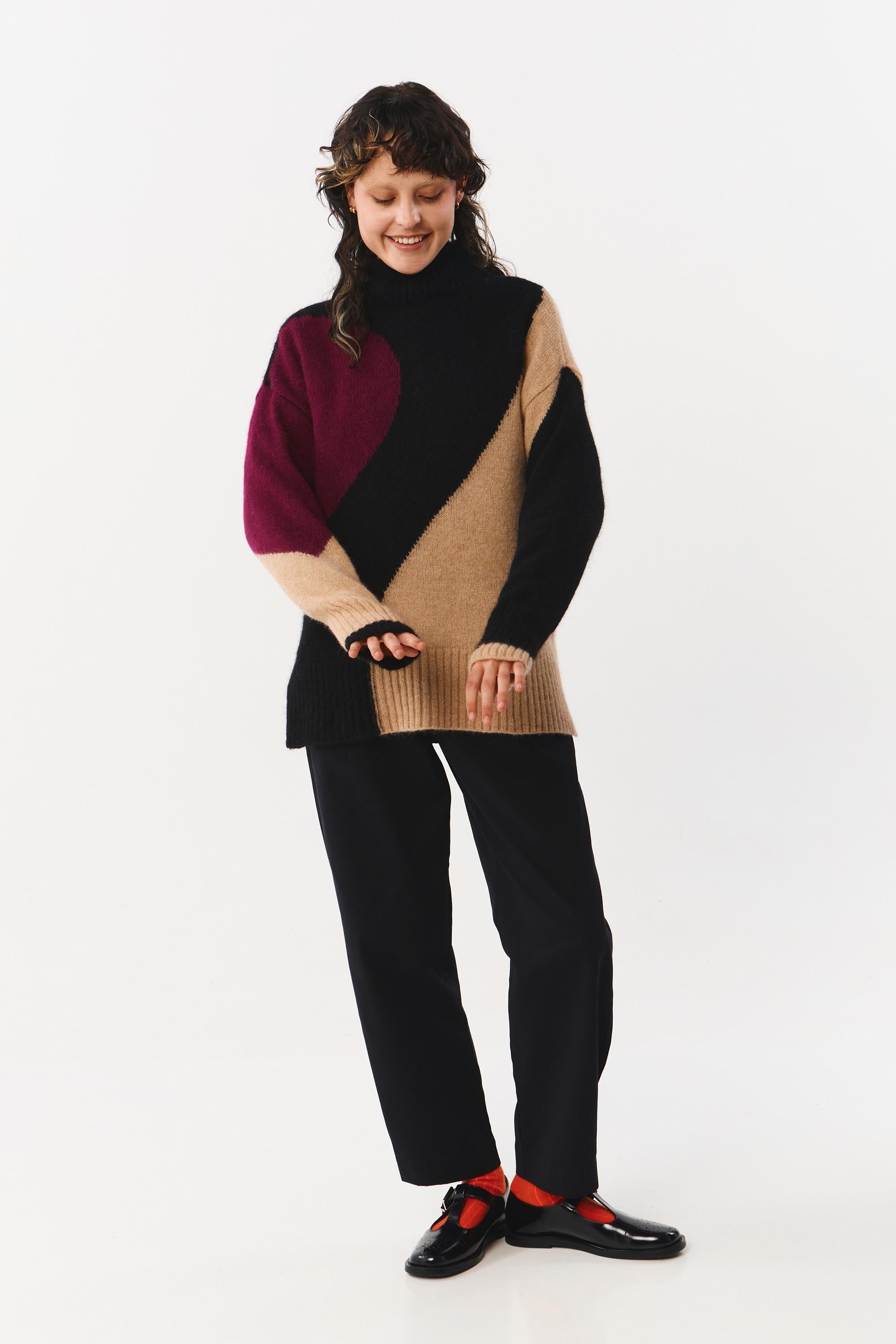 On olemassa mukavaa, ja sitten on Nun Jumper. Se on kehrätty eettisestä baby alpakasta ja erittäin hienosta merinovillasta, ja tämä oversized neule kietoo sinut pilvimäiseen lämpöön samalla kun se pitää ulkonäkösi terävänä. Runsas korkea kaulus ja laskettu olkalinja luovat rennon siluetin, kun taas sivuhalkiot tuovat liikettä ja modernia särmää. Pitkä pituus ja kevyt tuntuma - se on sellainen vaate, johon tarttuu kylminä aamuina, eikä halua riisua.