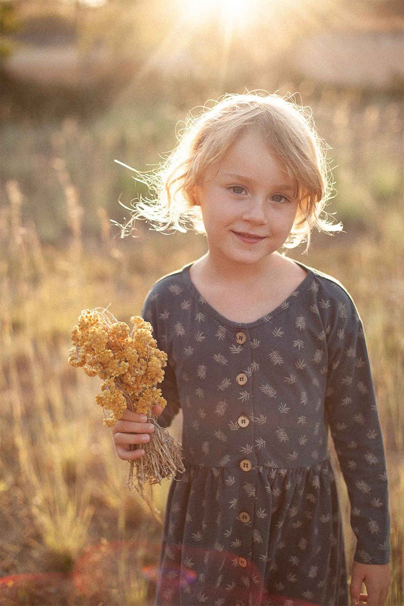 Lasten Sabrina pitkähihainen mekko, jossa on pudotetut olkapäät ja napeilla kokonaan peitetty halkio. Terrakotanvärinen, oliivinlehtipainatuksella.