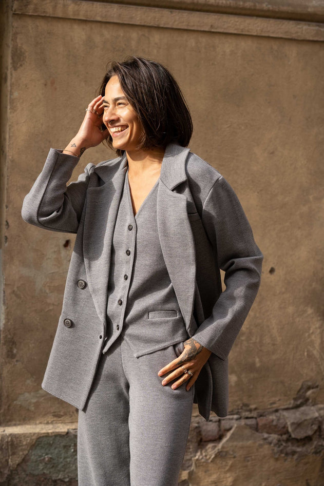 Ora-housuissa on rennot suorat lahkeet halkioilla, sivutaskut ja säädettävä joustava vyötärönauha yksilölliseen istuvuuteen. Forza-neulebleiserissä on trendikäs oversized muoto ja kaksirivinen etuosa taskuilla. Yhdistettynä Galante-liiviin, tämä setti yhdistää muodollisen tyylin ja rentojen vaatteiden kotoisan mukavuuden. Käytä niitä kolmen osan settinä tai yhdistä ja sekoita jokaista osaa muiden vaatekaappisi vaatteiden kanssa.