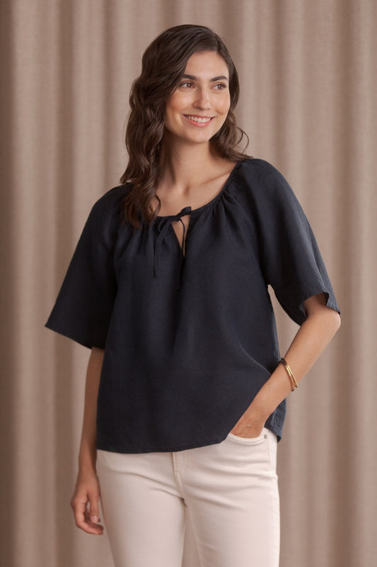 Rento lyhythihainen pellavatoppi, jossa on hieman levenevät hihat ja leveä pääntie, jota korostavat elegantit koristeelliset laskokset. Hienovarainen V-aukko edessä on viimeistelty herkällä solmittavalla nauhalla lisäviehätyksen vuoksi. Valmistettu 100% eurooppalaisesta pellavasta, se tarjoaa hengittävän, iholle ystävällisen tunteen, joka on täydellinen lämpimiin päiviin.