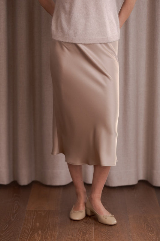 Tämä midi-pituinen satiinihame on valmistettu ensiluokkaisesta japanilaisesta tri-asetaattimuokatusta kuidusta, tarjoten loistavan, silkkisen pinnan. Kangas on helppohoitoinen ja säilyttää muotonsa kauniisti. Hienovarainen joustava vyötärönauha varmistaa mukavan ja imartelevan istuvuuden.