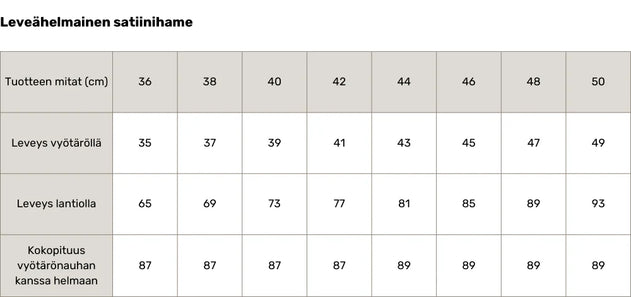 Nettiostoksilla kannattaa turvautua mittanauhan tai verkkokaupan kokotyökalun apuun. Tarkista vaatemerkin kehon mittojen mukainen kokotaulukko ja vaatteen mitat, jos ne ovat saatavilla. Ole tarvittaessa yhteydessä asiakaspalveluumme tarkempien mittojen saamiseksi.