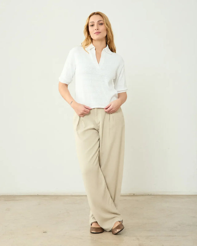 Joana Beige Pants are elegant dress pants with a refined drape, crafted from 100% Tencel for a soft, breathable feel. Featuring a mid-rise waist with darts, side pockets, and back buttonholes, they balance comfort with sophistication. Ethically produced in Spain, these versatile pants work as a wardrobe essential.