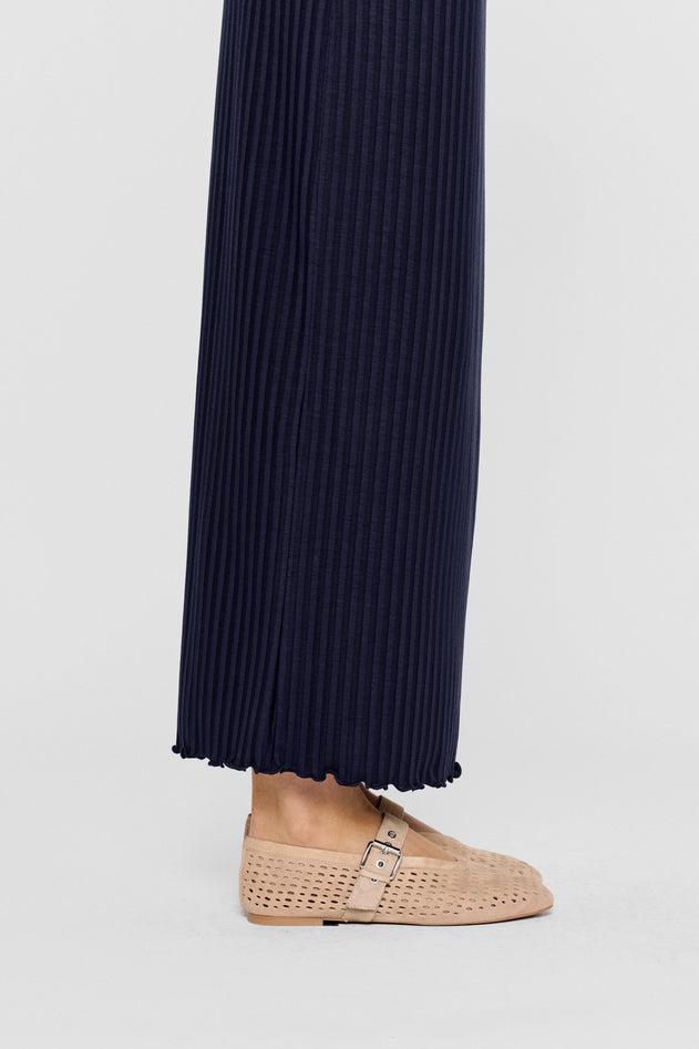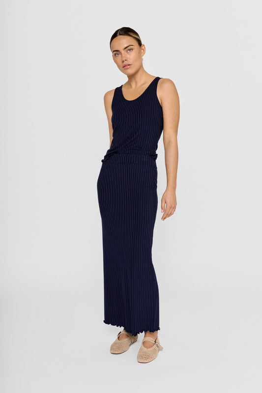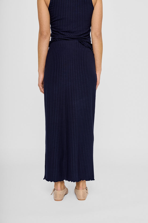 Pitkä Ribbi keskiyön sininen hame, jossa on suora siluetti ja salaatinlehtireunus. Kevyt neule-Ribbi on kiiltävä ja joustava, mikä tekee hameesta kevyen ja hulmuavan.