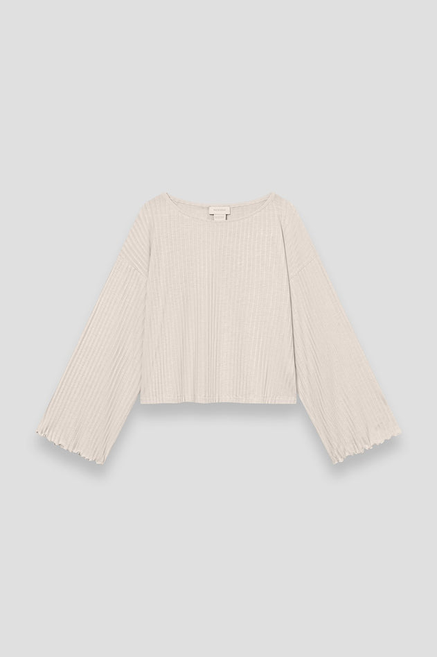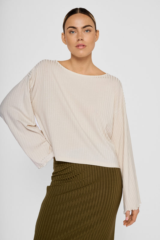 Vaaleanbeige pitkähihainen paita, jossa on hieman lyhyt istuvuus, leveä venepääntie ja pitkät lehtisleikatut hihat. Leikkisä neule-Ribbi on kiiltävä ja joustava, mikä tekee paidasta kevyen ja ilmavan.