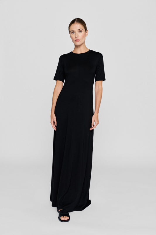 Musta kevyt maksimekko silkkisestä ja joustavasta TENCEL™ lyocell-sekoitteesta. Vartalonmyötäinen yläosa jatkuu virtaviivaiseen täyspitkään hameeseen. Silkkinen materiaali laskeutuu kehon ylle hienostuneen eleganssin ja helppouden saavuttamiseksi.