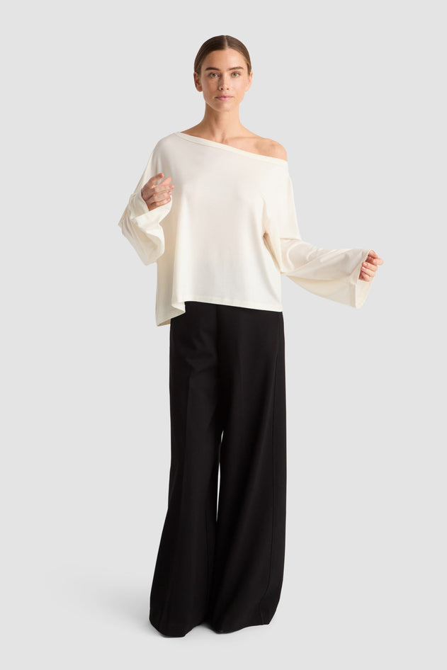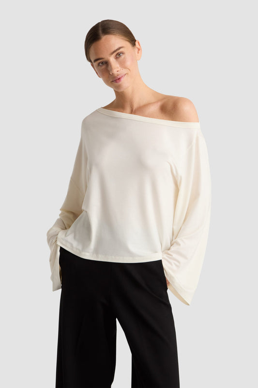 Gen Top Paper Valkoinen -puserossa on hieman lyhennetty, leveä laatikkomainen siluetti, joka tarjoaa modernin, rennon istuvuuden. Sen imarteleva olkapäät paljastava pääntie lisää ripauksen eleganssia, kun taas pitkät, rennot hihat parantavat mukavuutta ja liikkumisvapautta. Tämä pusero yhdistää nykyaikaisen tyylin vaivattomaan käytettävyyteen, tehden siitä monipuolisen lisän mihin tahansa vaatekaappiin.