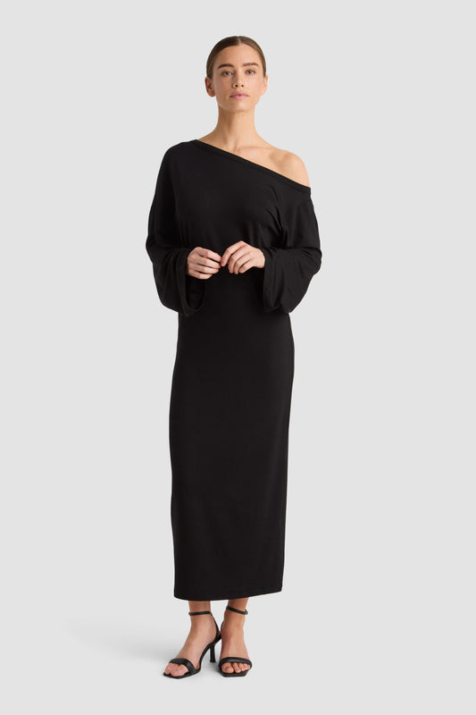 Giovanna-mekko mustana sisältää hienostuneen epäsymmetrisen olkapään ulkopuolisen kaula-aukon, joka lisää eleganssia. Sen räätälöity istuvuus kapenee kevyesti helmaa kohti, korostaen lantiota hienostuneen siluetin luomiseksi. Pitkät, rennot hihat lisäävät vaivattoman tyylin vivahteen, tehden tästä mekosta monipuolisen valinnan sekä muodollisiin että tyylikkäisiin rentoihin tilaisuuksiin.