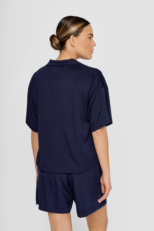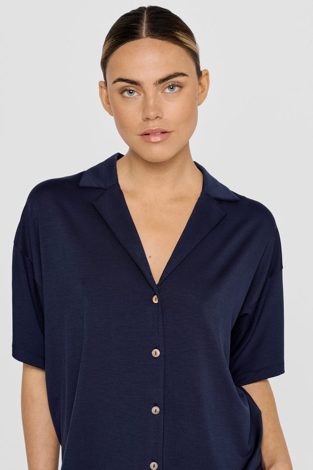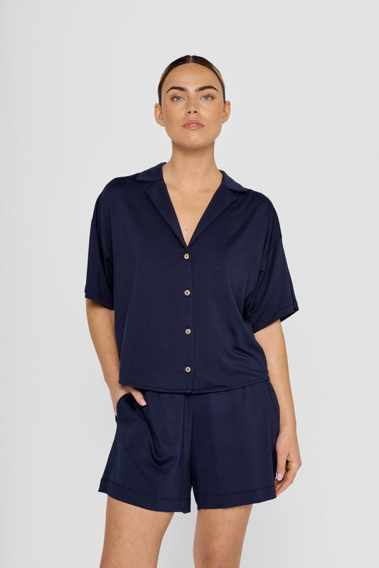 Kevyt jersey-pusero, jossa rento, laatikkomainen siluetti. Shiba on hieman lyhyt malli, nappikiinnitys, lyhyet hihat ja pehmeä lovettu kaulus, joka muodostaa V-pääntien. Materiaali on silkkistä ja joustavaa, ja kookospähkinänapit on valmistettu elintarviketeollisuuden jätteestä.