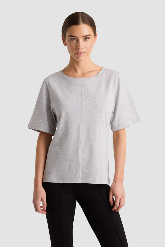 Thea Tee harmaassa melangessa tarjoaa hienostuneen mutta rennon istuvuuden, jossa on hienovaraisesti määritelty vyötärö, joka korostaa siluettia mukavuudesta tinkimättä. Sen elegantit räätälöintiyksityiskohdat ja pyöristetty pääntie antavat hienostuneen ilmeen, mikä tekee siitä monipuolisen vaatteen, joka sopii sekä rentoihin että huoliteltuihin asuihin. Suunniteltu tasapainottamaan tyyli ja helppous, tämä t-paita on asiantunteva valinta niille, jotka etsivät hillittyä eleganssia jokapäiväiseen pukeutumiseen.