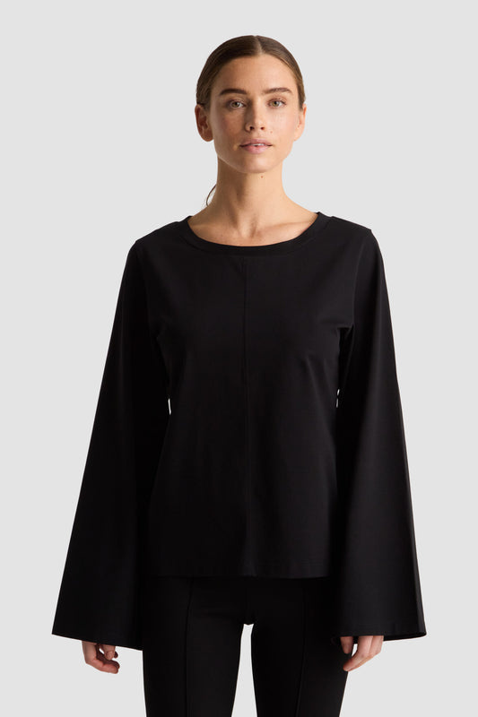 Musta Thelma Top tarjoaa hienostuneen mutta rennon istuvuuden, jossa on hienovaraisesti määritelty vyötärö, joka korostaa siluettia mukavuudesta tinkimättä. Taidokkaasti räätälöity elegantteja yksityiskohtia sisältävä pusero esittelee pyöreän pääntien ja pitkät, leveät hihat, jotka lisäävät hienostuneisuutta tähän monipuoliseen vaatekappaleeseen. Ihanteellinen niille, jotka etsivät hillittyä tyyliä huolitellulla viimeistelyllä.