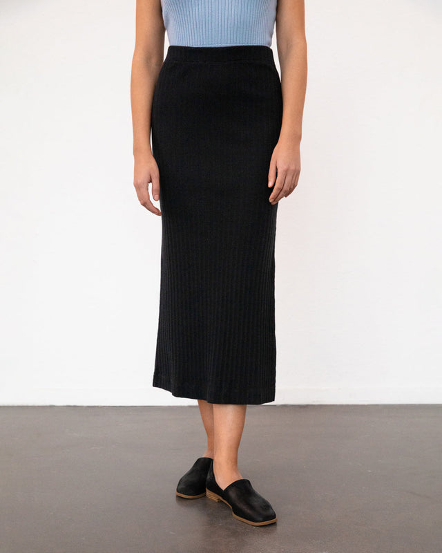 Minimalistinen hame, jossa on keskipitkä pituus ja käytännöllinen halkio tuuletusta ja liikkumisvapautta varten. Käsin ommeltu neulotusta luomupuuvillakankaasta, jossa on hunajakennokuvio.