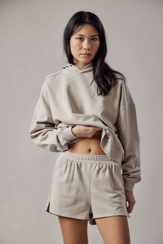 Naisten shortsit, joissa on sivuhalkiot ja sävy sävyyn kirjailtu logo.