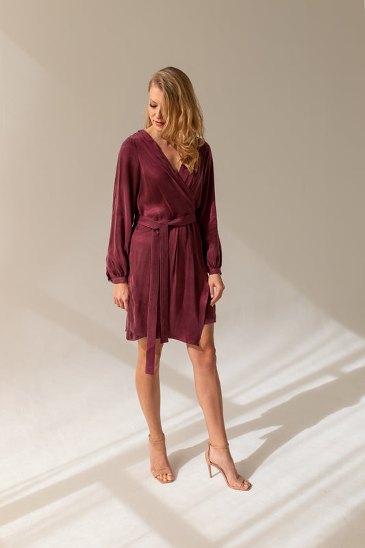 Laurel Burgundy -mekko on elegantti cocktail-mekko. Mekossa on suljettu kirjekuorileikkaus ja se suljetaan sivulta vetoketjulla. Mekko on hieman löysä vyötäröltä ja siinä on erillinen vyö, jolla voit säätää vyötäröä, sitoa rusetiksi tai antaa roikkua. Mekon hihat ovat hieman pussimaiset hihansuissa, kiinnitetty kankaalla päällystetyllä napilla. Mekko on valmistettu cupro-virtaavasta kankaasta, jossa on viskoosivuori.