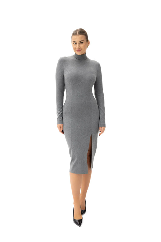 Tämä tyylikäs mekko on leikattu istuvaksi, mikä korostaa kauniisti naisellista siluettia. Klassinen poolokaulus ja pitkät hihat tekevät siitä ihanteellisen valinnan muodollisiin tilaisuuksiin. Hienovarainen halkio jalassa lisää herkkyyttä ja helpottaa liikkumista. Edessä oleva tikkaus muotoilee hahmon hienovaraisesti, korostaen sen mittasuhteita. Mekko ulottuu juuri polven yläpuolelle, mikä huokuu hienostuneisuutta ja tyylikkyyttä. Se on viimeistelty piilovetoketjulla takana saumattoman ilmeen saavuttamiseksi.