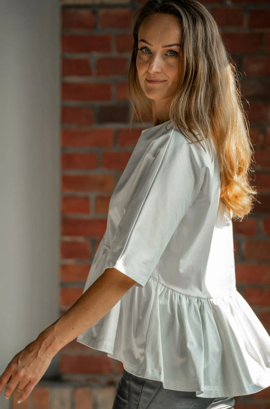 Liisa on löysä, röyhelöyksityiskohtainen T-paita, joka on valmistettu puuvillasatiinista hienovaraisella kiillolla.
