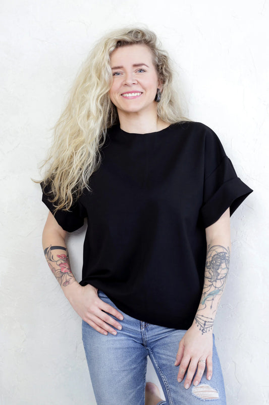 Nomi on miellyttävän tilava, ylisuurikokoinen t-paita, joka on valmistettu hieman paksummasta punta-kankaasta ilman saumoja hihojen reunoissa, alaosassa ja kauluksessa. Koska se on kutistumaton kangas, voit leikata t-paidan itsellesi sopivaan pituuteen tai muuttaa esimerkiksi hihan pituutta tarvittaessa.
