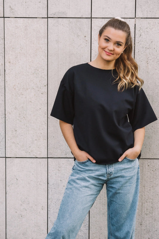 Nomi on miellyttävän tilava, ylisuurikokoinen t-paita, joka on valmistettu hieman paksummasta, punta-kankaasta ilman saumoja hihansuiden, helman ja kauluksen reunoilla. Koska kangas ei kutistu, voit leikata t-paidan itsellesi sopivaan pituuteen tai muuttaa esimerkiksi hihan pituutta tarvittaessa.