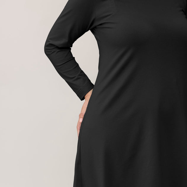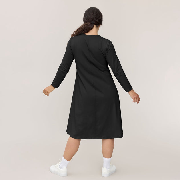 Kellomekko on valmistettu ohuesta, pehmeästä ja joustavasta puuvillamodaalista. Sivusauman taskut ovat käytännöllinen yksityiskohta. Leveälahkeisessa mekossa on sauma keskellä takana.