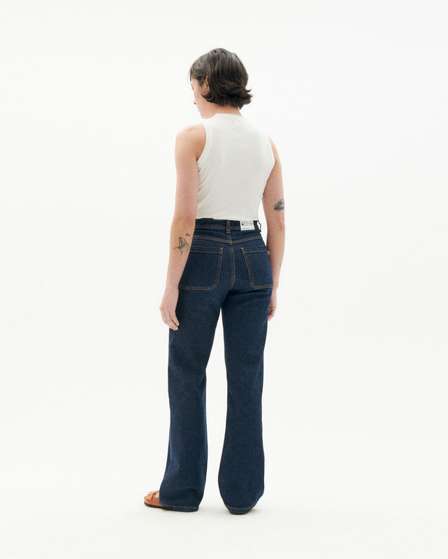 Theresa tummat puhtaat farkut, valmistettu luomupuuvillasta.