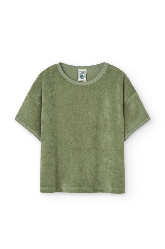 Lasten oversized T-paita vihreänä. Valmistettu pehmeästä luomupuuvillaisesta froteekankaasta. Tämä T-paita on suunniteltu tarjoamaan äärimmäistä mukavuutta ja rentoa istuvuutta.