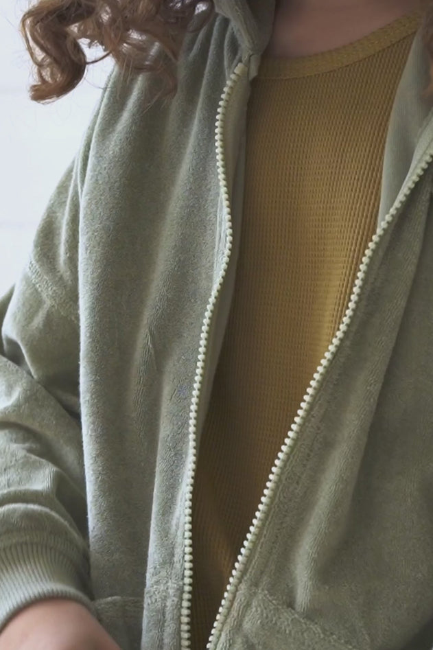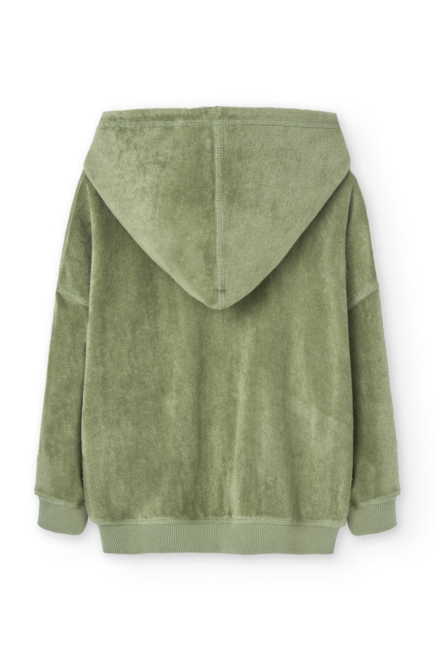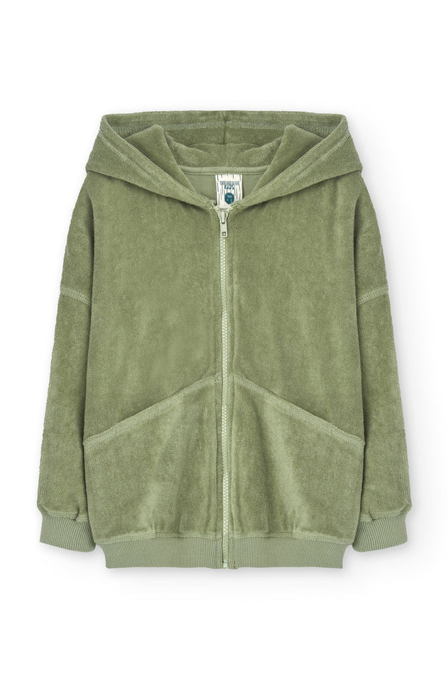 Lasten huppari, jossa on väljä istuvuus ja laskettu hihat. Froteekangas kauniissa vihreässä värissä. Mukava ja täydellinen jokaiselle vuoden päivälle.