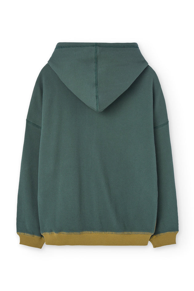 Lasten huppari, jossa on löysä istuvuus ja laskettu hihat. Waffle-kangas sinisen ja sinapinvärisessä väripalkkimuotoilussa. Mukava ja täydellinen jokaiselle vuoden päivälle.
