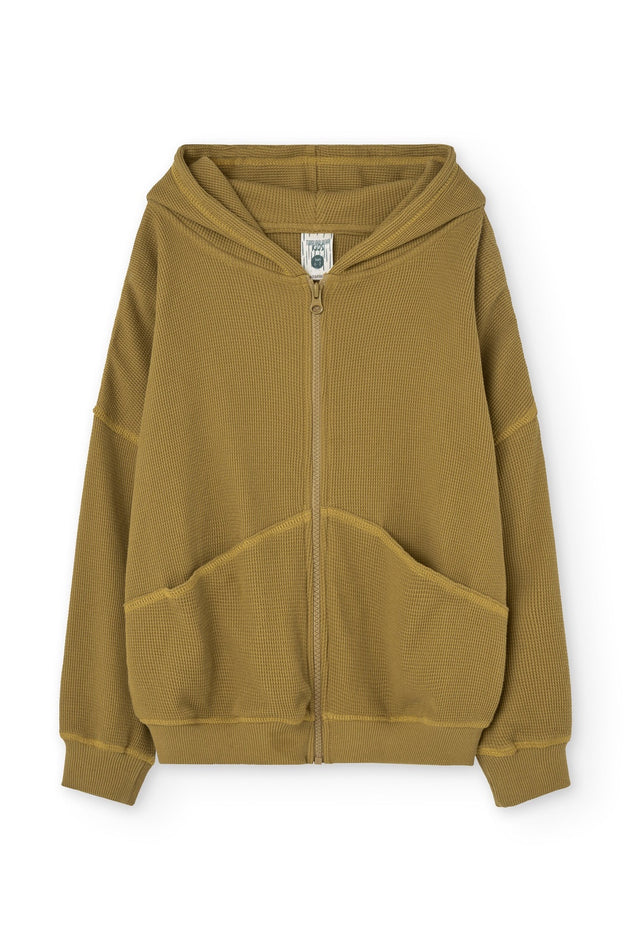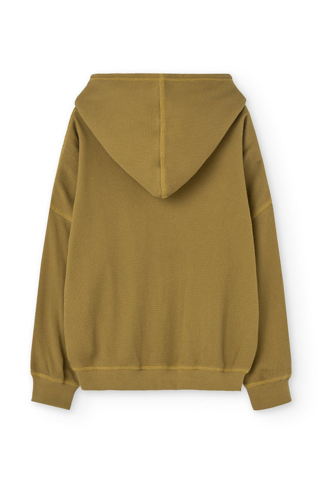 Lasten huppari, jossa on löysä istuvuus ja laskettu hihat. Voimakkaan sinapin värinen vohvelikangas. Mukava ja täydellinen jokaiseen vuoden päivään.