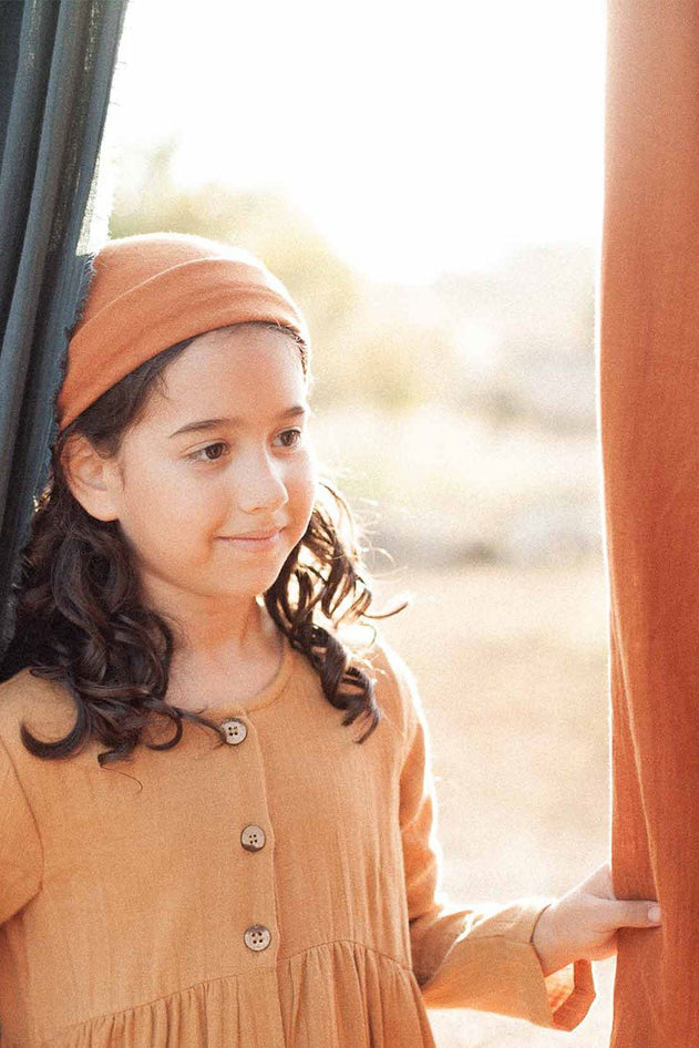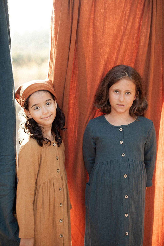 Lasten Simone-mekko sinapinvärisenä, pitkät hihat, paikkataskut ja halkio kookospähkinänapeilla.