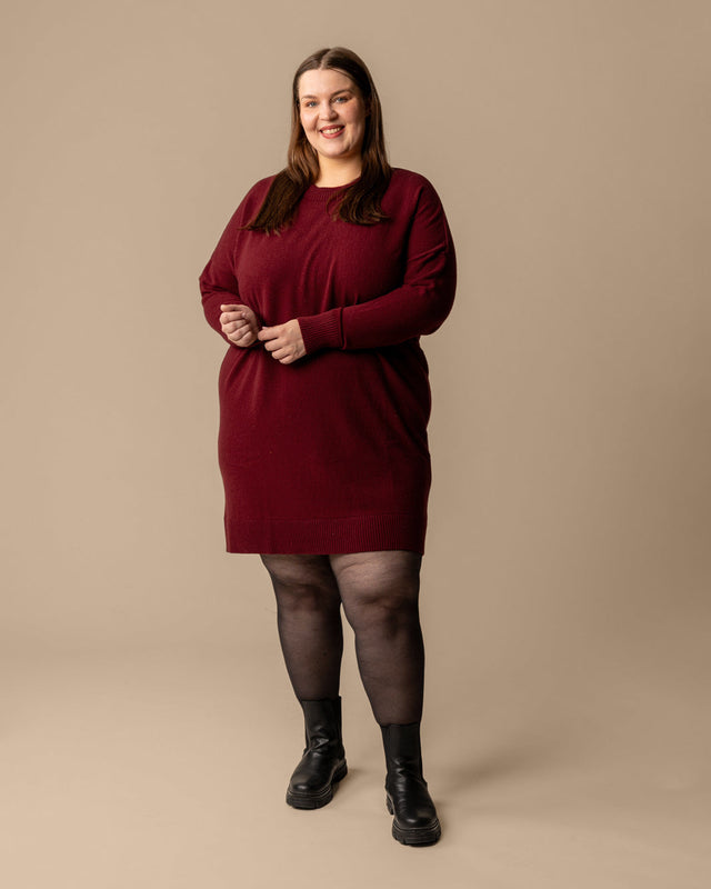 Tämä tyylikäs Kajo-neulemekko on valmistettu 100 % mulesing-vapaasta merinovillasta, tarjoten lämpöä pehmeällä ja hengittävällä tunteella. Sen sulava laskeutuvuus täydentää sukkahousuja tai leggingsejä vaivattomasti, tehden siitä monipuolisen lisän vaatekaappiisi. Esitettynä syvässä burgundin sävyssä, se yhdistää tyylin ja mukavuuden viileämpiin päiviin.