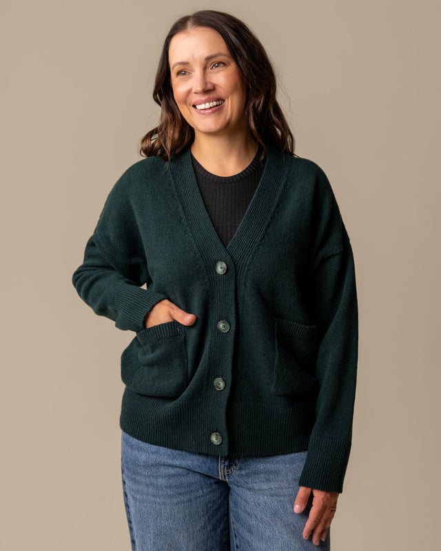 Kaste-neuletakki, jossa on syvä tummanvihreä sävy, tarjoaa sekä tyyliä että mukavuutta. Se on valmistettu 100% mulesing-vapaasta merinovillasta, mikä takaa poikkeuksellisen pehmeyden ja lämmön. Käytännölliset taskut ja napitettava etuosa tekevät tästä neuletakista täydellisen kerrospukeutumiseen ja mukavaan käyttöön viileämpinä päivinä. Sen syvä, viileä vihreä sävy lisää hienostuneen kosketuksen mihin tahansa asuun.
