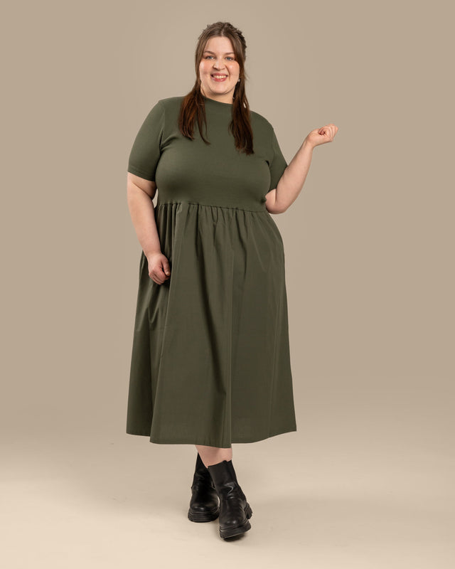 Miellyttävä mekko, jossa yhdistyvät t-paitahihat ja tyylikäs poolokaulus. Istuva yläosa on valmistettu joustavasta Ribbi neuloksesta, kun taas levenevä hame on tehty sileästä puuvillakankaasta. Käytännöllisillä sivutaskuilla viimeistelty, se on täydellinen yhdistelmä mukavuutta ja eleganssia.