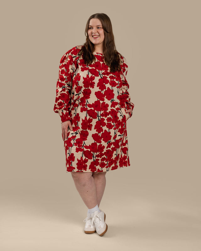 Viehättävä pitkähihainen mekko, jossa on tyylikkäät laskostetut hihat ja klassinen istuvuus. Siinä on suora helma ja käytännölliset sivusaumataskut. Kaunistettu kauniilla Valmut-kuviolla, se on sekä tyylikäs että toimiva.